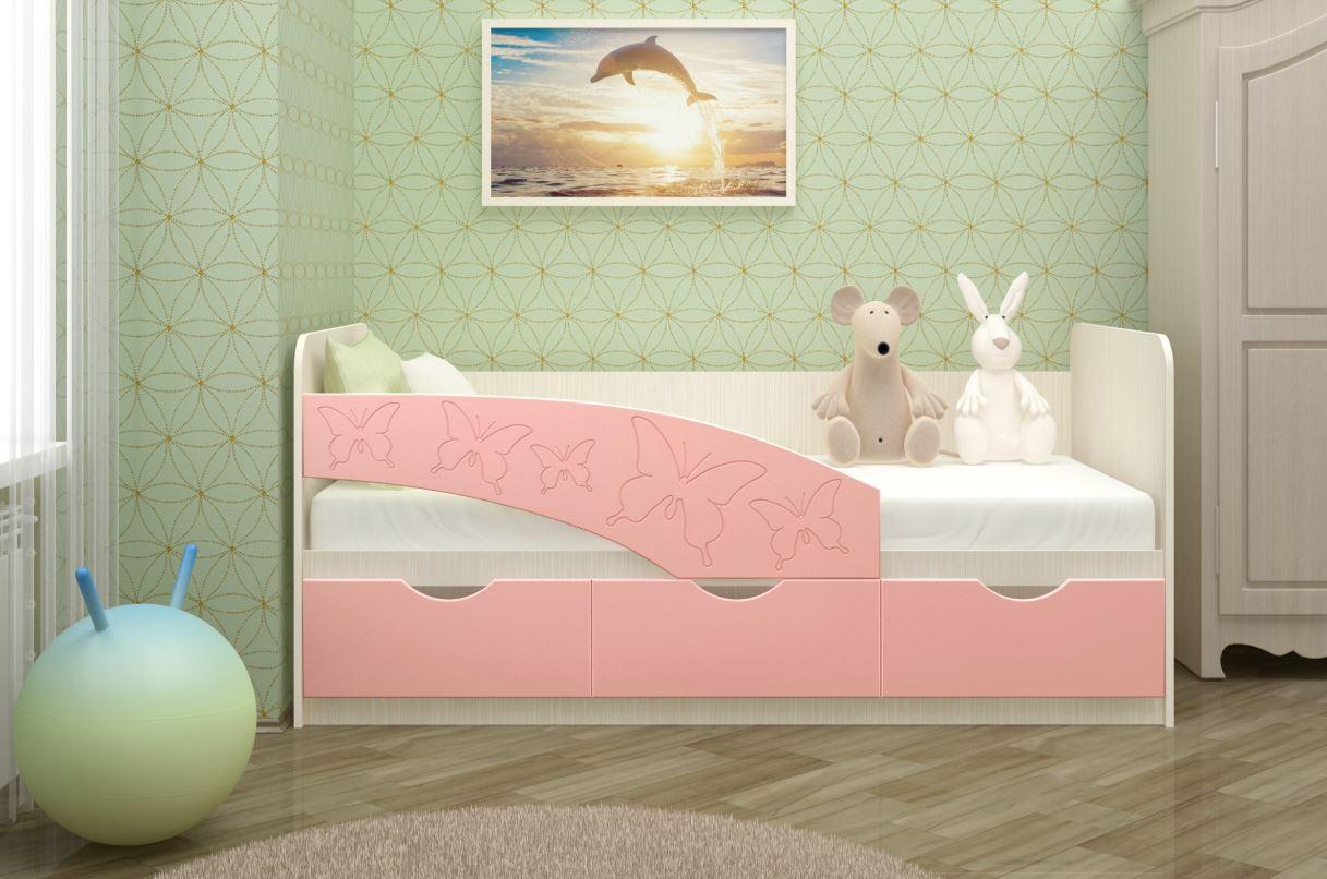 Детская кровать Бабочки — недорогая, красивая и практичная модель в современном стиле. Выполнена из ЛДСП и ПВХ.