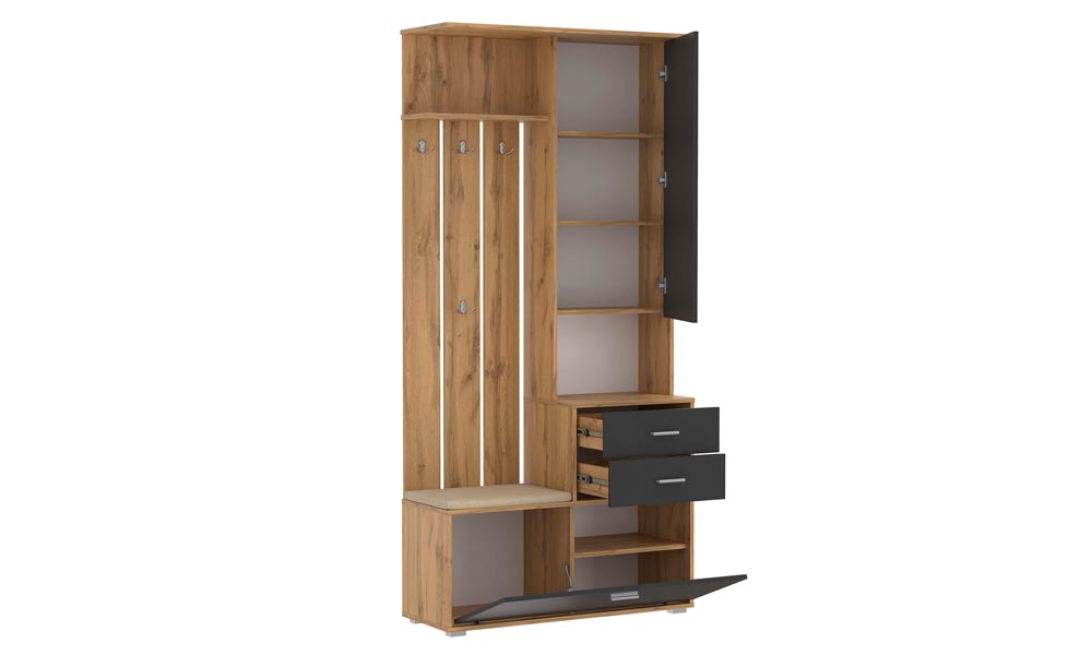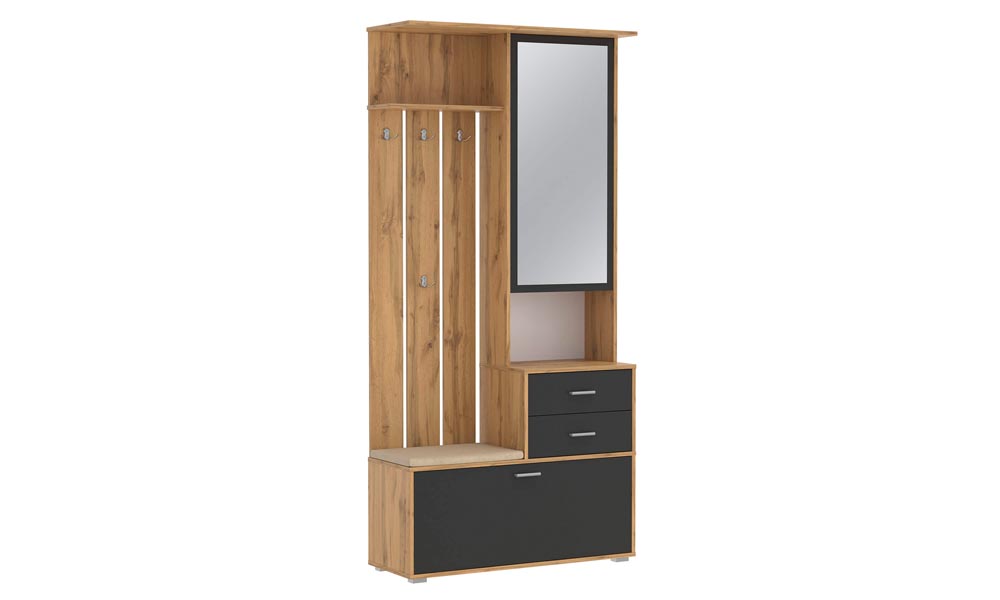 • - Прямой Темный набор для прихожей имеет две двери ( одну глухую одну зеркальную ) два выдвижных ящика с использованием механизма полного выдвижения и плавного закрывания, дно ящика выполнено из ЛДВП в цвет корпуса