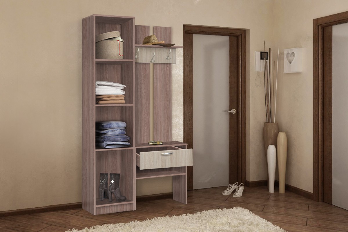 Прихожая имеет простой дизайн и прямые формы, включает пенал с зеркалом с тремя просторными полками и вешалку с тремя трёхрожковыми крючками для одежды, антресольной полкой для головных уборов, выдвижным ящиком и открытой нишей.