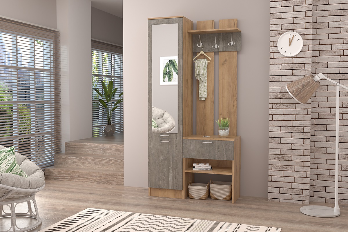 Прихожая имеет простой дизайн и прямые формы, включает пенал с зеркалом с тремя просторными полками и вешалку с тремя трёхрожковыми крючками для одежды, антресольной полкой для головных уборов, выдвижным ящиком и открытой нишей.
