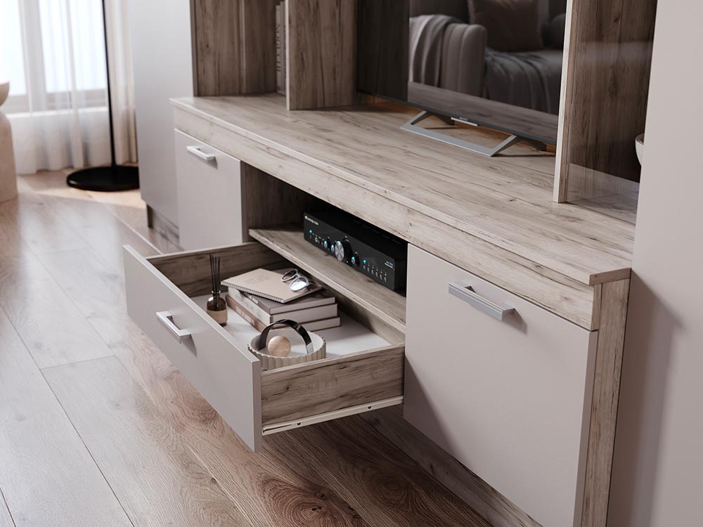 один выдвижной ящик с использованием механизма полного выдвижения и плавного закрывания, дно ящика выполнено из ЛДВП в цвет корпуса