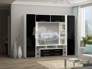 Гостиная Гармония — композиция в стиле модерн, с элементами хай-тек. Стенка выполнена из высококачественной ЛДСП (корпус) с глянцевыми фасадами МДФ. Гостиная оборудована широкой тумбой ТВ с открытыми полками, нишами и выдвижными ящиками; шкафами для одежды и белья.