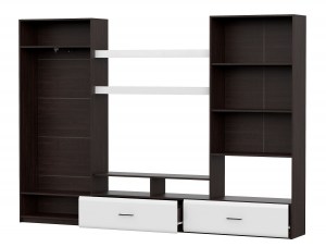 Размеры ниши под ТВ 1200х758х300 мм. Тумба состоит из секции с двумя выдвижными ящиками, открытой ниши, разделенной пополам вертикальной перегородкой и надстройкой. Надстройка в свою очередь состоит из секции со створками (правая глухая, левая со стеклом) и открытой ниши. В секции со створками устанавливаются две съемных полки. Шкаф комплектуется стационарными полками и выдвижной евроштангой. Максимально допустимая нагрузка на навесные полки — 5 кг. Сборка не универсальная.