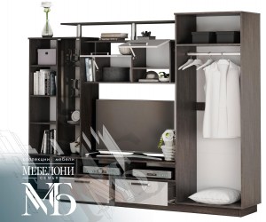 - Данная модель имеет много места для хранения и комплектуется шкафом со штангой и полкой, витриной со стеклом, тумбой для ТВ и полкой,