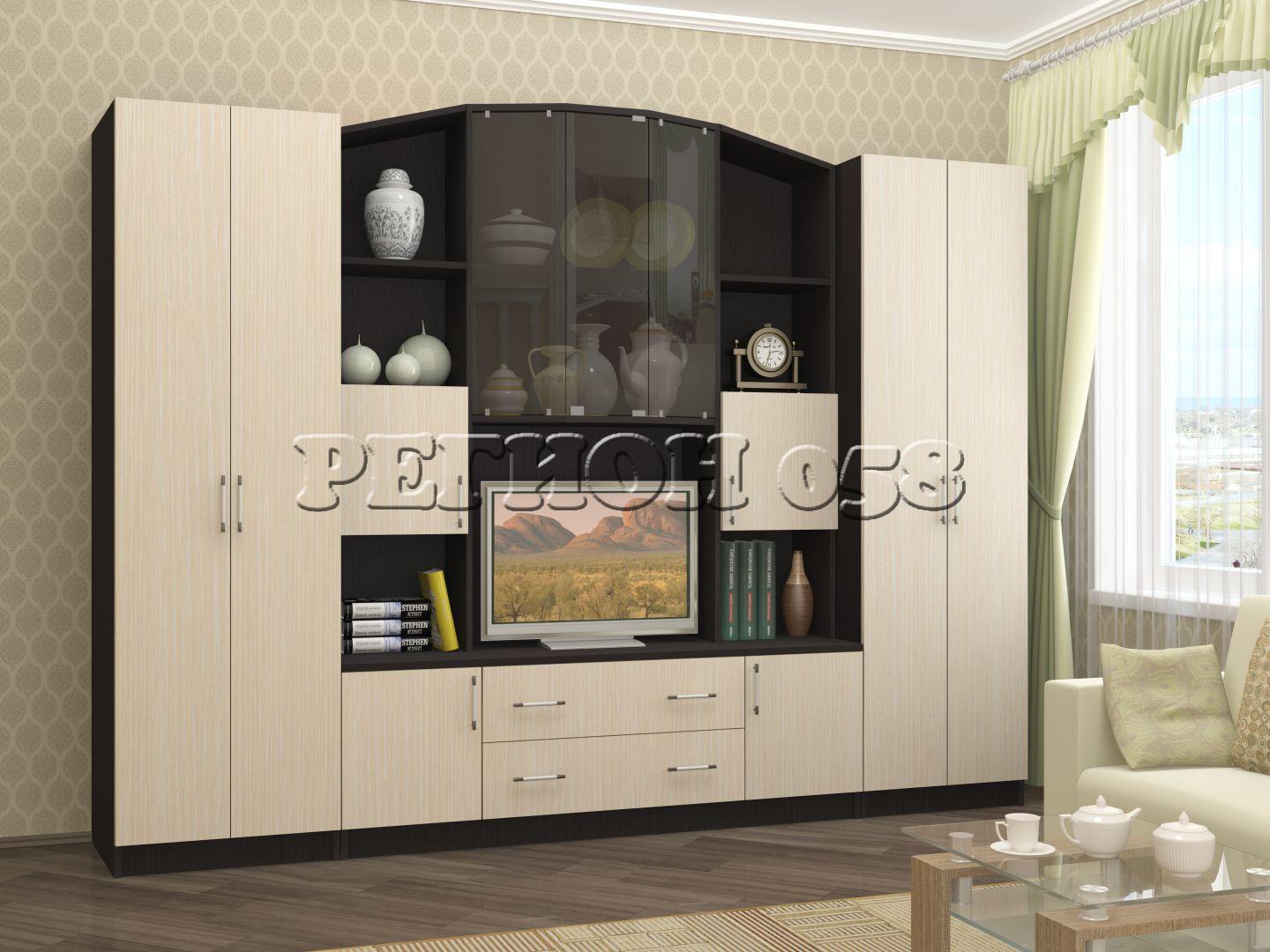- Данная модель имеет много места для хранения и комплектуется шкафом со штангой и полкой, витриной со стеклом, тумбой для ТВ и полкой,