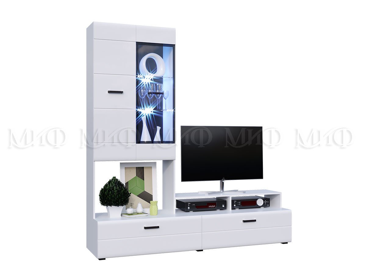 • - Прямой Белый набор для гостиной имеет две двери ( одну глухую одну стеклянную ) два выдвижных ящика с использованием механизма полного выдвижения и плавного закрывания, дно ящика выполнено из ЛДВП в цвет корпуса