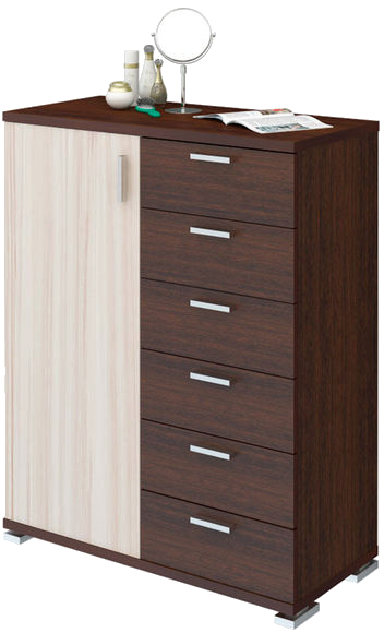 шесть выдвижных ящиков с использованием механизма полного выдвижения и плавного закрывания, дно ящика выполнено из ЛДВП в цвет корпуса