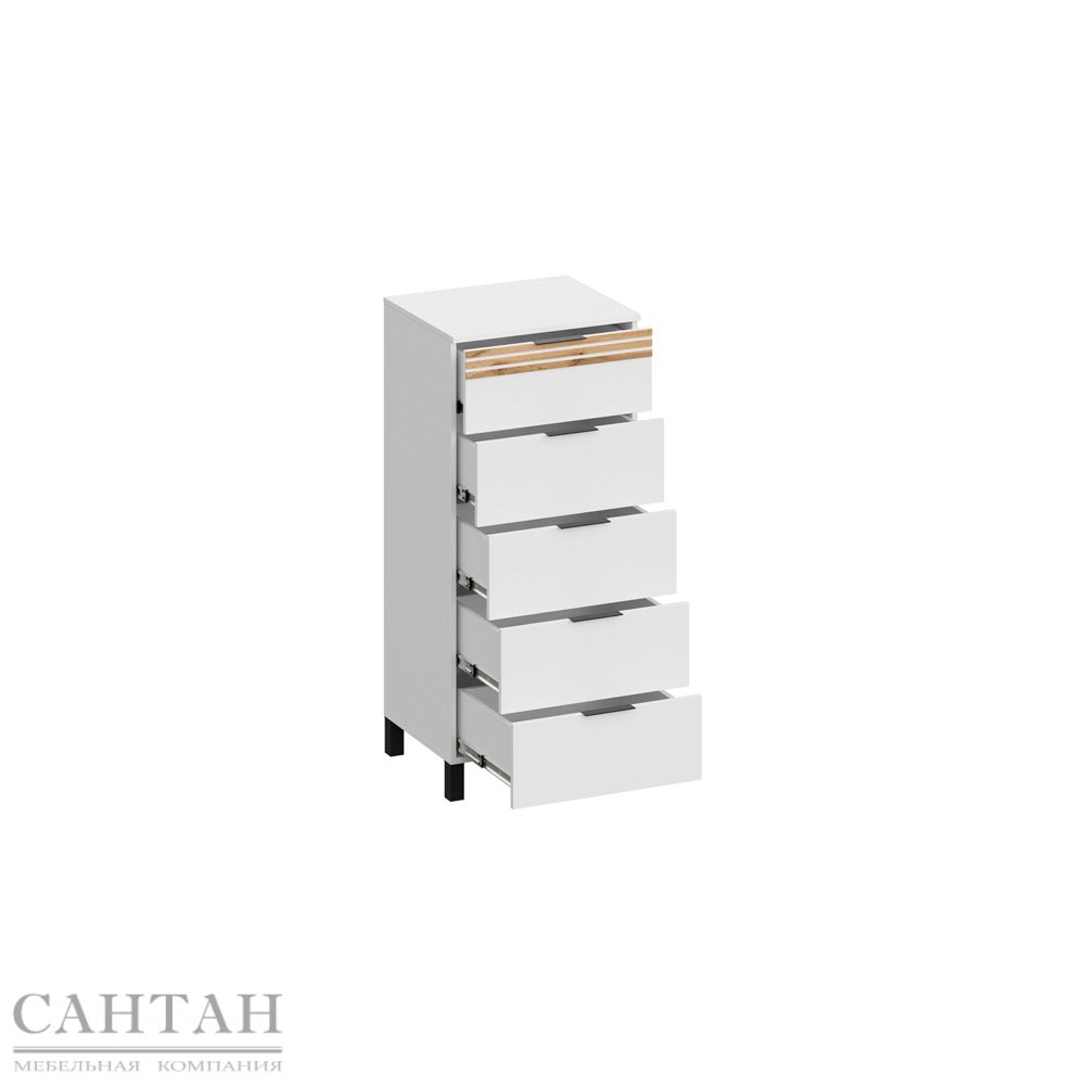 пять выдвижных ящиков с использованием механизма полного выдвижения и плавного закрывания, дно ящика выполнено из ЛДВП в цвет корпуса