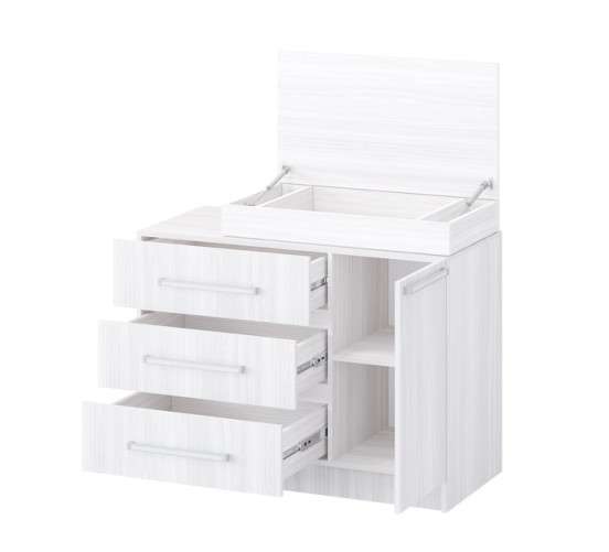 три выдвижных ящика с использованием механизма полного выдвижения и плавного закрывания, дно ящика выполнено из ЛДВП в цвет корпуса