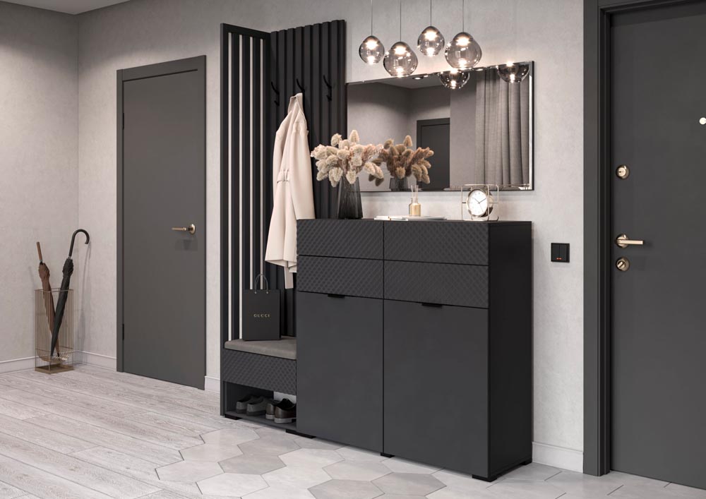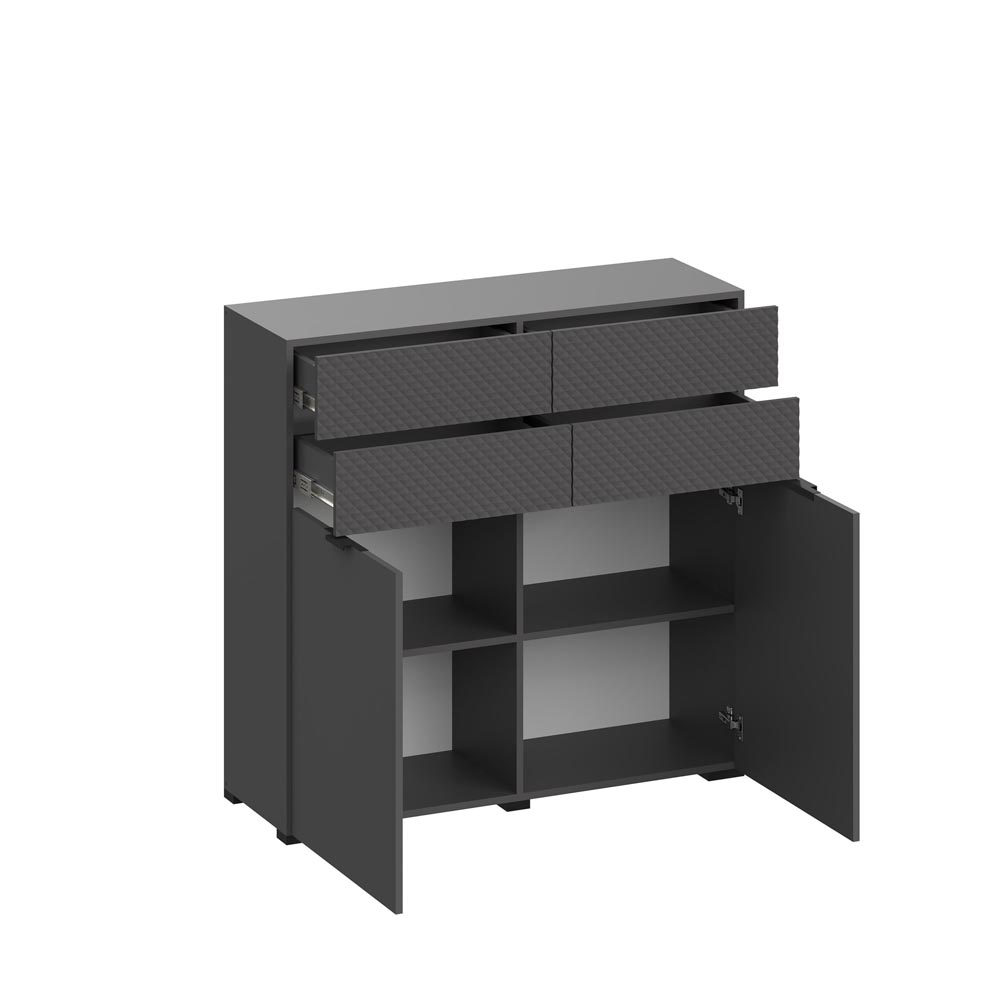 четыре выдвижных ящика с использованием механизма полного выдвижения и плавного закрывания, дно ящика выполнено из ЛДВП в цвет корпуса