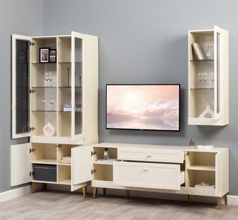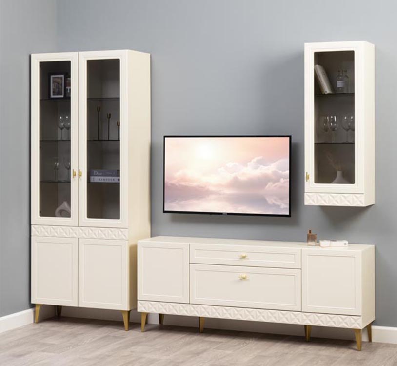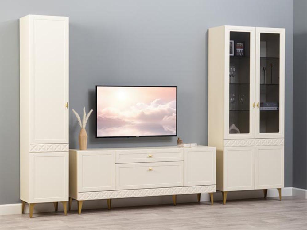 Гостиная Марион в цвете Слоновая кость особенно хорошо сочетается с натуральными материалами — деревом, льняными тканями, керамикой. Этот оттенок создает спокойную атмосферу для отдыха, а модульная система позволяет оптимально использовать пространство даже в небольших гостиных.