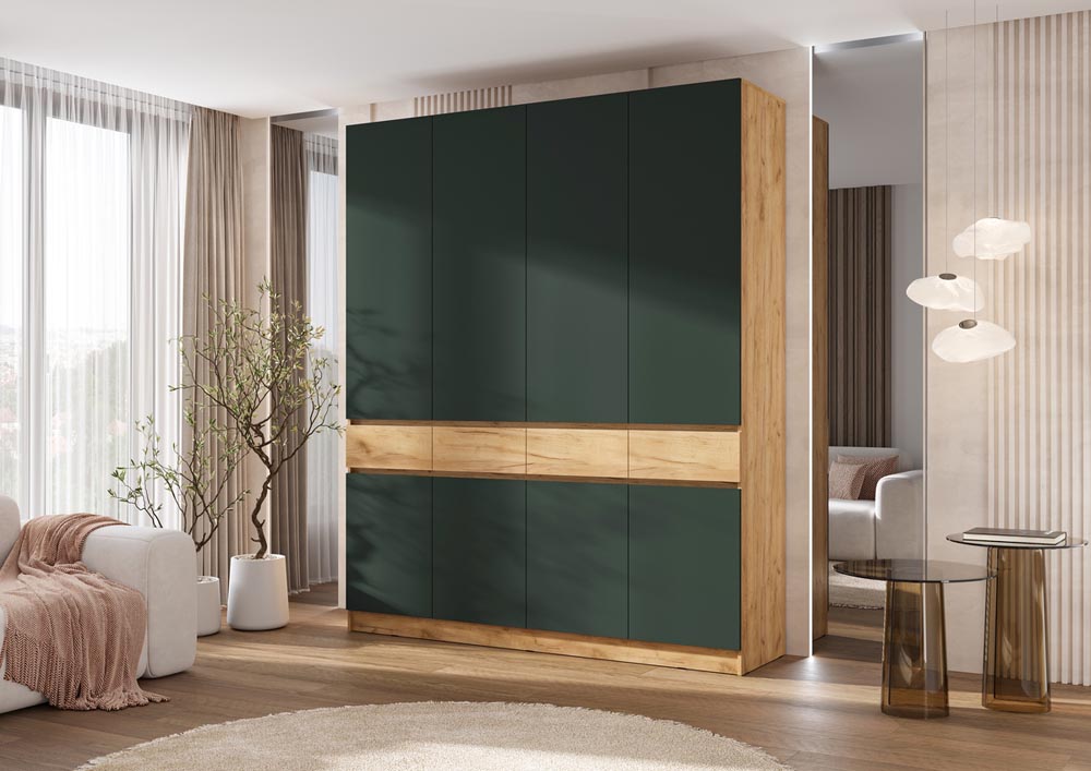 четыре выдвижных ящика с использованием механизма полного выдвижения и плавного закрывания, дно ящика выполнено из ЛДВП в цвет корпуса