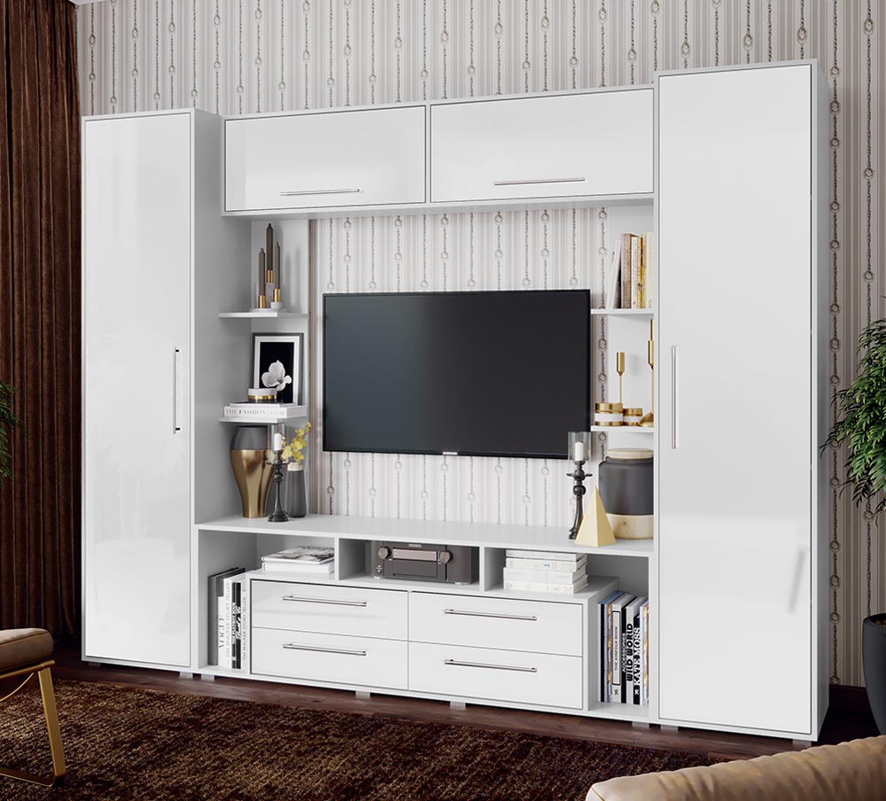 Гостиная Гармония — композиция в стиле модерн, с элементами хай-тек. Стенка выполнена из высококачественной ЛДСП (корпус) с глянцевыми фасадами МДФ. Гостиная оборудована широкой тумбой ТВ с открытыми полками, нишами и выдвижными ящиками; шкафами для одежды и белья.