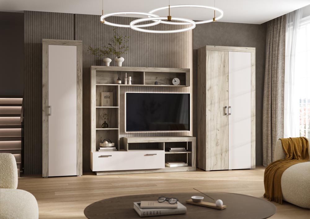 Модульная гостиная «Ангара» от мебельной фабрики «Миф» сочетает в себе лаконичность современного дизайна и уют природной эстетики. Тёплый оттенок дуба сонома с выразительной текстурой дерева создаёт атмосферу естественной гармонии, а чистый белый цвет визуально расширяет пространство, наполняя его светом. Чёткие геометрические формы и минималистичные фасады подчёркивают contemporary эстетику, а продуманные детали демонстрируют баланс функциональности и стиля.